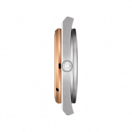 Son boitier est de type tonneau abrite une fine lunette dorée rose qui fait écho aux index, aiguilles, et guichet dateur.