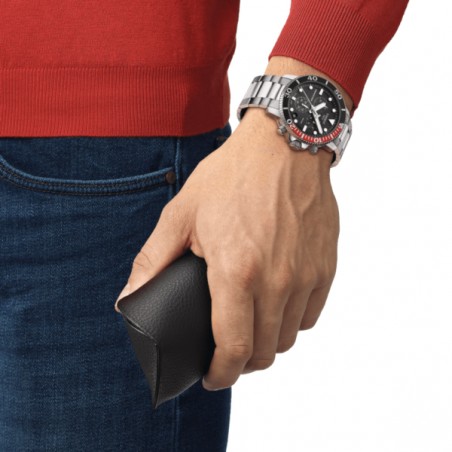 Il encadre un boitier rond surmonté d’une lunette bicolore rouge et noir pour un effet dynamique.