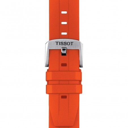 Son bracelet est en silicone souple orange et se referme grâce à une boucle standard.