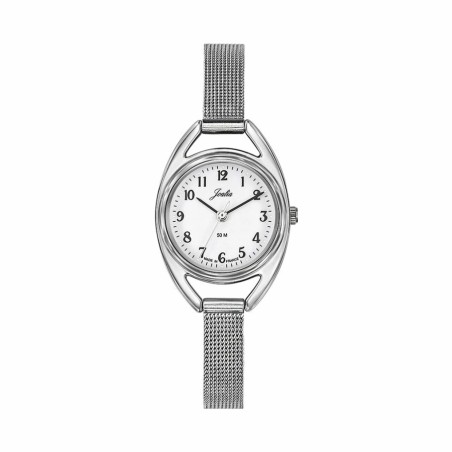 Le boitier ovale argenté s'allie à merveille au cadran rectangulaire qui fait totalement la différence et met en valeur les index et les aiguilles noirs.