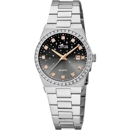 Montre Lotus Femme Freedom acier argenté fond noir avec oxydes de zirconium