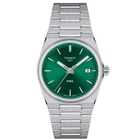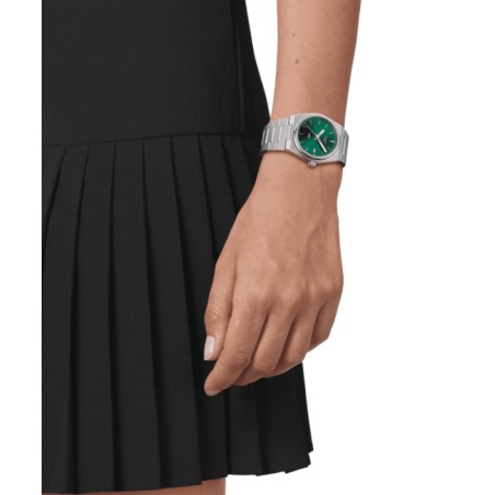 Son boitier gris argent abrite un cadran vert affichant des index blancs ainsi qu’un mécanisme à trois aiguilles.