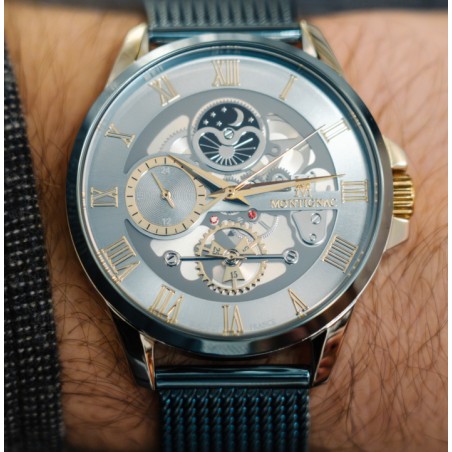 Montre Montignac en acier avec bracelet en maille milanais et cadran bleu