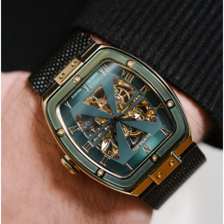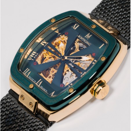 Montre Montignac en acier avec bracelet en maille milanaise noire et cadran vert