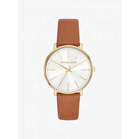 Son bracelet en cuir marron enserre un boitier rond doré de 38mm.