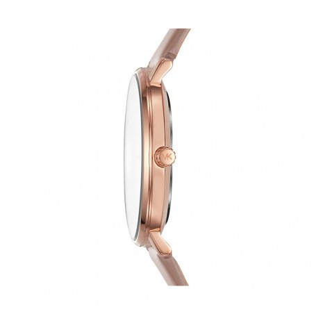 Son boitier rond doré rose de 38mm est entouré d’un bracelet en cuir beige.