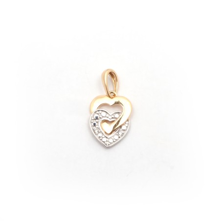 La bijouterie en ligne Carador vous présente ce pendentif bicolor en Or 750/000 en forme de deux coeurs imbriqués. Le premier est en Or jaune 750/000, le deuxième en Or blanc 750/000 serti de diamants. Idéal à porter sur un chaine de type or blanc ou or jaune. Ce pendentif est le cadeau parfait pour une fillette, une adolescente ou une femme. Il saura faire plaisir et preuve d'affection, ilse porte facilement au quotidien.