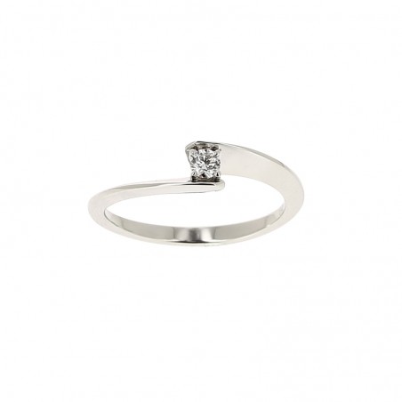 Cet anneau en or blanc 750/000 affiche une ligne plate et asymétrique serti en son centre d’un diamant 0.10 carat.